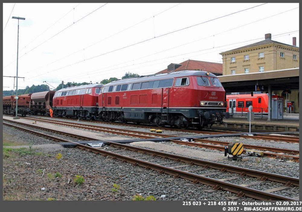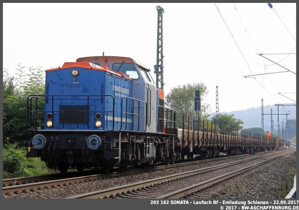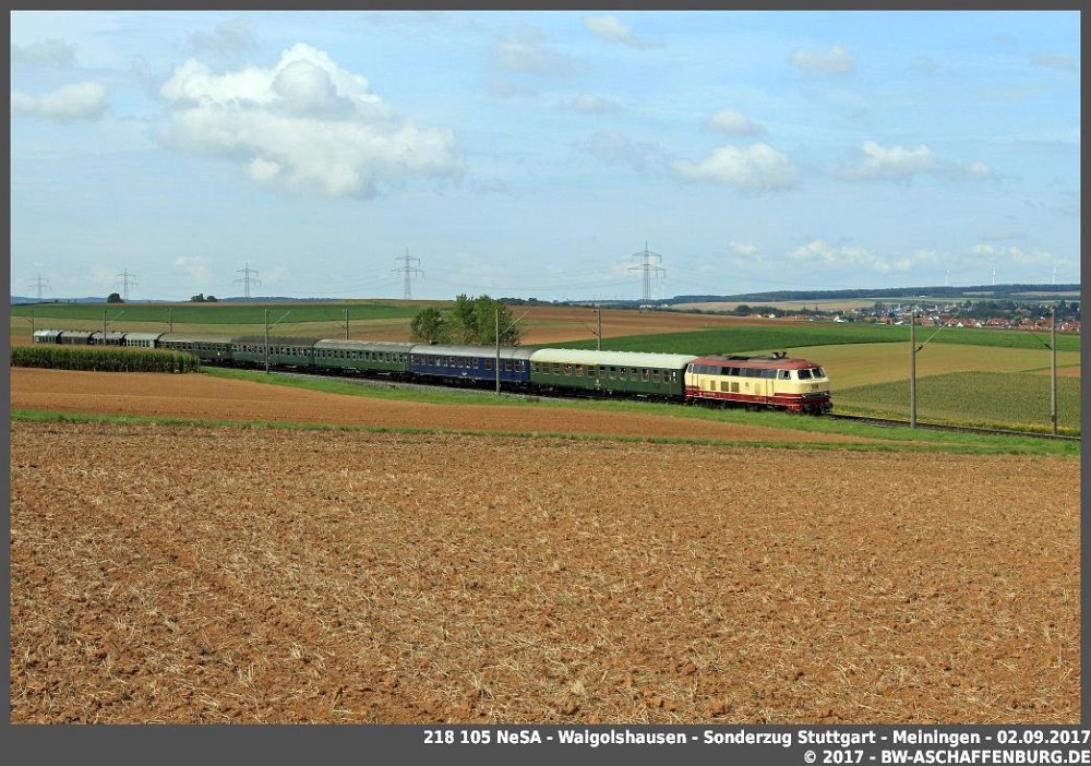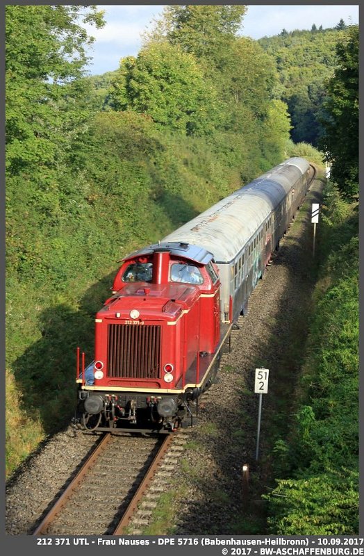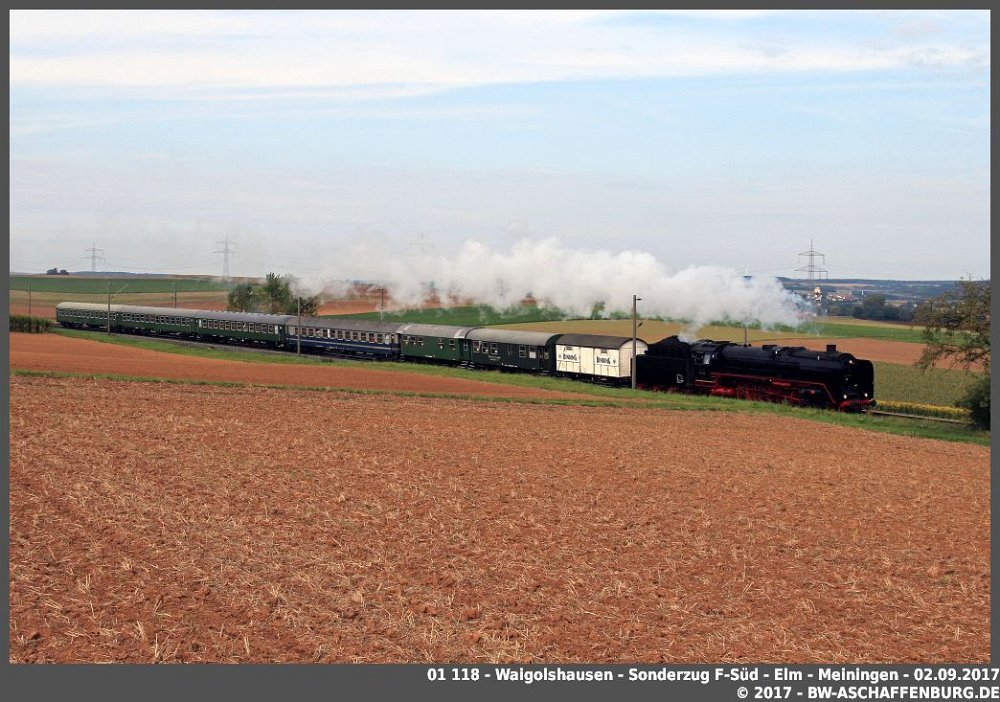 01 118Waigolshausen / 02.09.2017 / Sonderzug F-Süd - Elm - Meiningen 111 216Waigolshausen / 02.09.2017 / Ersatzzug nach Bamberg 218 105 NeSAWaigolshausen / 02.09.2017 / Sonderzug Stuttgart - (Veitshöchheim) - Meiningen 140 439 BAYERNBAHNMainaschaff BÜ / 08.09.2017 215 023 + 218 455 EfWOsterburken / 02.09.2017 / Bauzug V270.09 + V270.10 SGLWürzburg Bw / 02.09.2017 187 080Aschaffenburg Hbf / 05.09.2017 245 010 SOBLaufach Bf / 09.09.2017 / Sonderzug Mühldorf - Amorbach / 15 Jahre Regionetze 212 371 UTLBabenhausen Kleestadt / 10.09.2017 / DPE 5716 Babenhausen - Heilbronn 192 961 SIEMENS VECTRONLaufach Bf / 09.09.2017 / Überführung U-Bahn Riad 212 371 UTLFrau Nauses / 10.09.2017 / DPE 5716 Babenhausen - Heilbronn 193 825 RETRACKLaufach Bf / 16.09.2017 3 442 214 + 3 442 215 - 3-LÖWEN-TAKTAschaffenburg Hbf / 19.09.2017 203 162 SONATALaufach Bf / 22.09.2017 193 848 EGPLaufach Bf / 16.09.2017 187 312 RAILPOOLAschaffenburg Hbf / 20.09.2017 WLE 82 [187 010]Laufach Stockacker / 15.09.2017 242.516 HECTORTAIL - FERDINANDLaufach Bf / 22.09.2017 Beuerlbach / 23.09.2017 / DPE 20096 Tübingen - Neuenmarkt-Wirsberg 111 120Fichtenberg / 23.09.2017 / RB Backnang - Schwäbisch-Hall-Hessental August 2017Oktober 2017