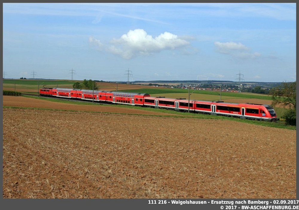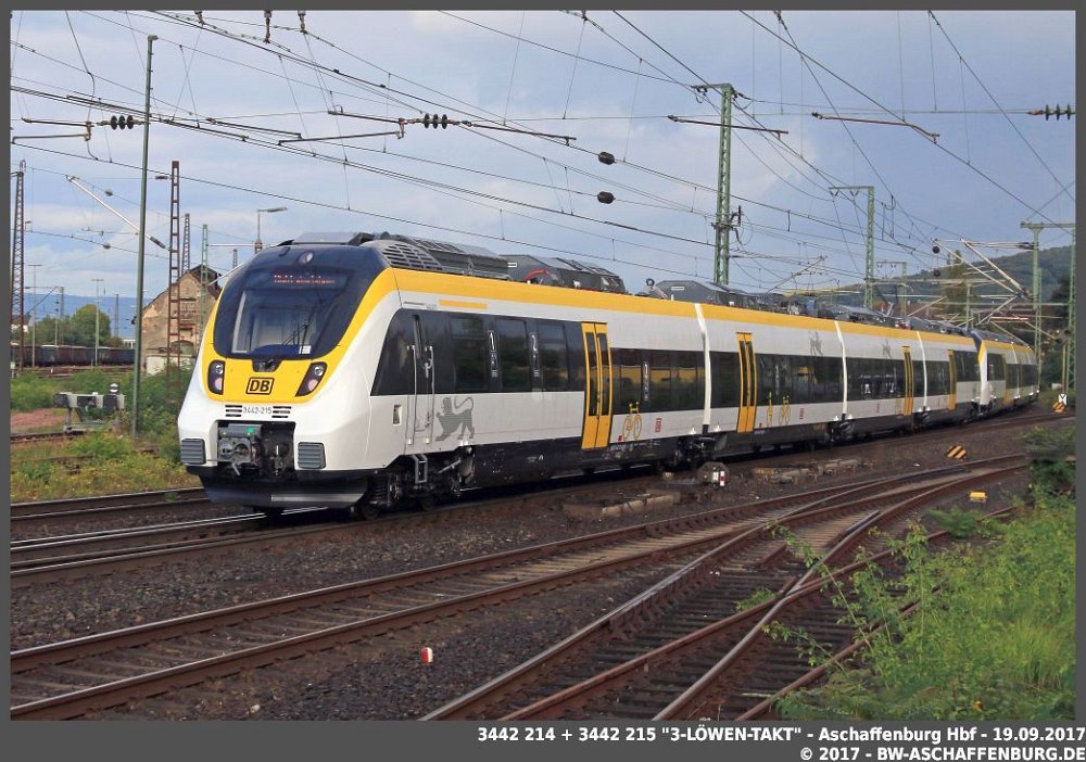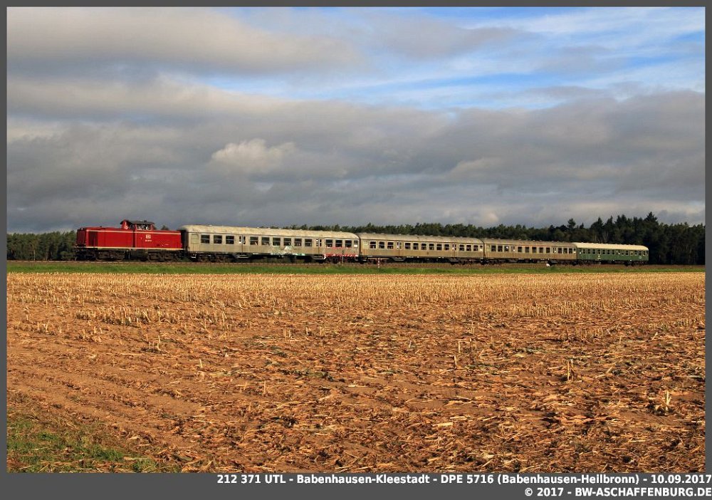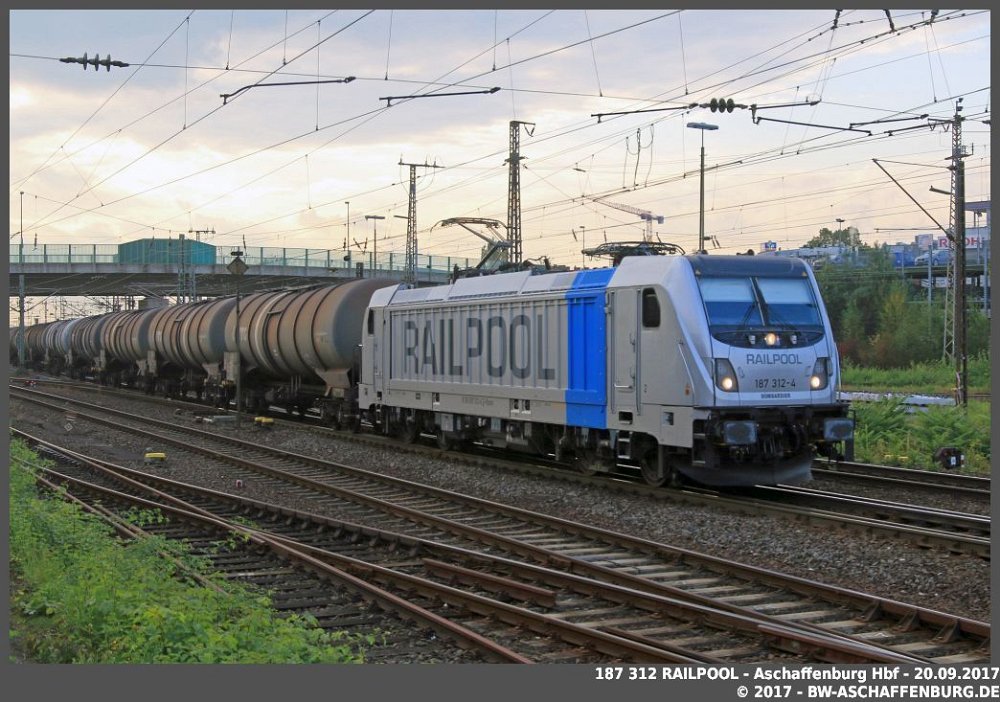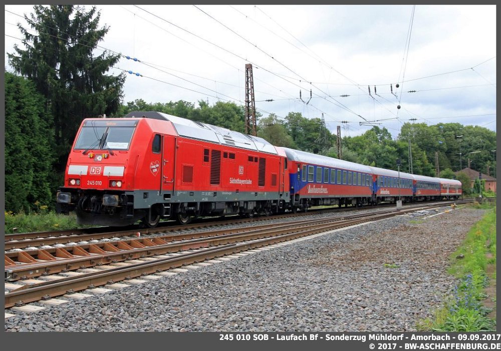 01 118Waigolshausen / 02.09.2017 / Sonderzug F-Süd - Elm - Meiningen 111 216Waigolshausen / 02.09.2017 / Ersatzzug nach Bamberg 218 105 NeSAWaigolshausen / 02.09.2017 / Sonderzug Stuttgart - (Veitshöchheim) - Meiningen 140 439 BAYERNBAHNMainaschaff BÜ / 08.09.2017 215 023 + 218 455 EfWOsterburken / 02.09.2017 / Bauzug V270.09 + V270.10 SGLWürzburg Bw / 02.09.2017 187 080Aschaffenburg Hbf / 05.09.2017 245 010 SOBLaufach Bf / 09.09.2017 / Sonderzug Mühldorf - Amorbach / 15 Jahre Regionetze 212 371 UTLBabenhausen Kleestadt / 10.09.2017 / DPE 5716 Babenhausen - Heilbronn 192 961 SIEMENS VECTRONLaufach Bf / 09.09.2017 / Überführung U-Bahn Riad 212 371 UTLFrau Nauses / 10.09.2017 / DPE 5716 Babenhausen - Heilbronn 193 825 RETRACKLaufach Bf / 16.09.2017 3 442 214 + 3 442 215 - 3-LÖWEN-TAKTAschaffenburg Hbf / 19.09.2017 203 162 SONATALaufach Bf / 22.09.2017 193 848 EGPLaufach Bf / 16.09.2017 187 312 RAILPOOLAschaffenburg Hbf / 20.09.2017 WLE 82 [187 010]Laufach Stockacker / 15.09.2017 242.516 HECTORTAIL - FERDINANDLaufach Bf / 22.09.2017 Beuerlbach / 23.09.2017 / DPE 20096 Tübingen - Neuenmarkt-Wirsberg 111 120Fichtenberg / 23.09.2017 / RB Backnang - Schwäbisch-Hall-Hessental August 2017Oktober 2017