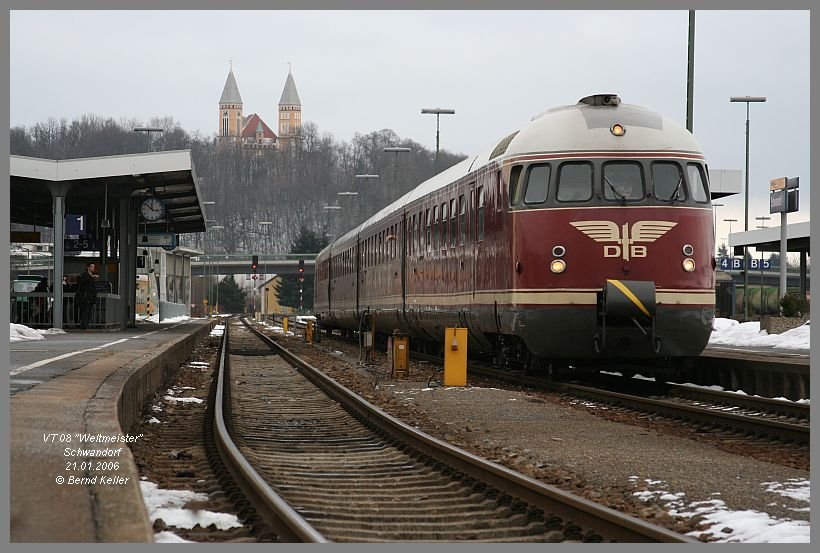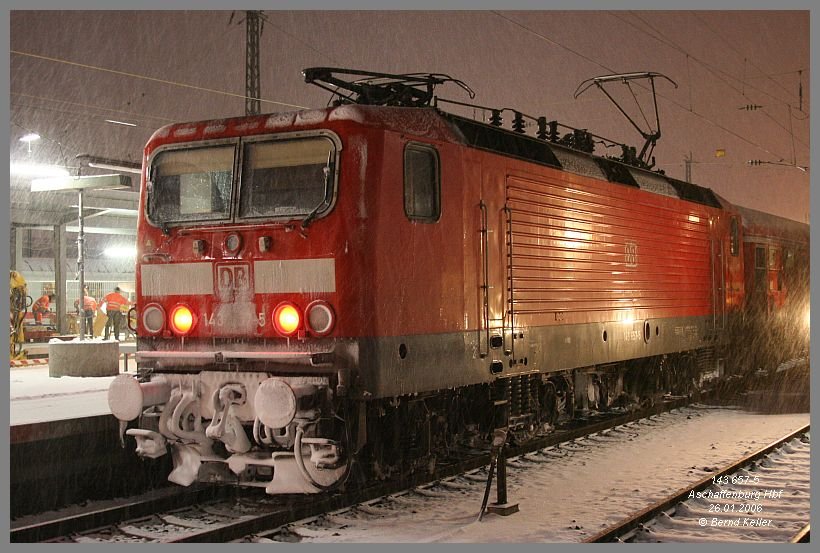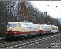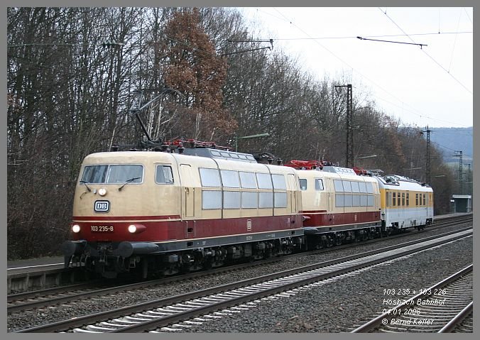 An einem kalten Januartag harrten einige hartgesottene Eisenbahnfreunde in Hösbach Bf aus, um diese Doppel-Traktion 103er mit Messzug abzulichten.