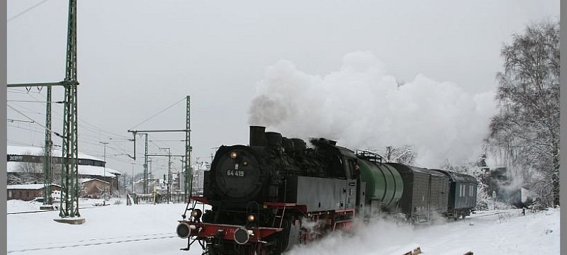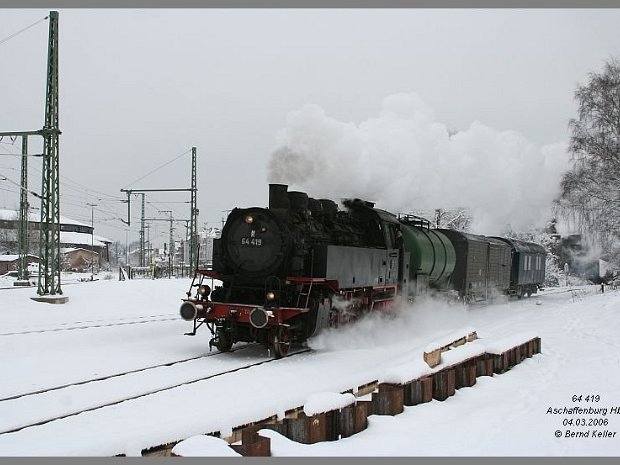 Eine schwarze, dampfende 64er im Winter sind nach Ende der Dampflokbeheimatung in Aschaffenburg vor über 35 Jahren, schon
