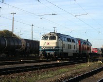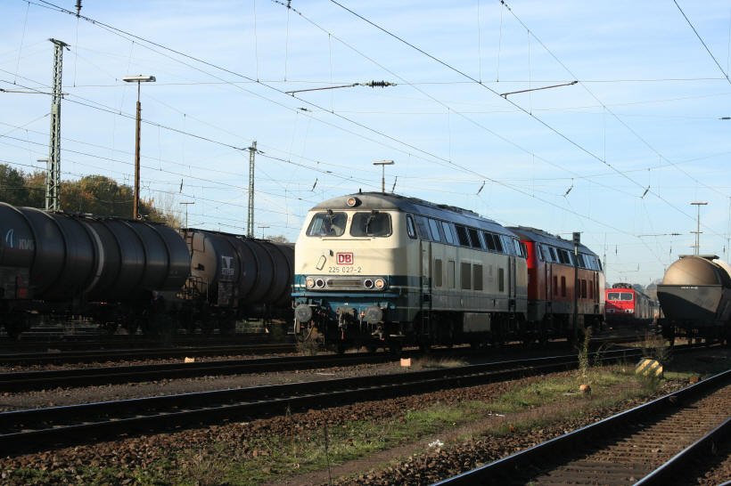 In Aachen-West ist derzeit die Heimat eine der beiden letzten Dieselloks in der Farbgebung ozeanblau-beige. So war 225 027 am 07.11.2006 mit der Schwesterlok…