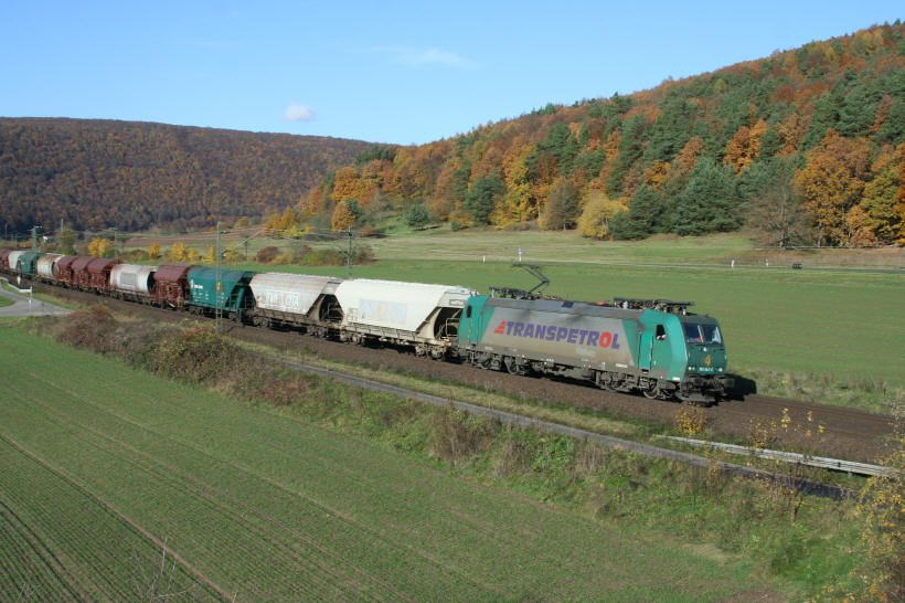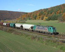 Schönes Herbstwetter und grüne Lok. Am 15.11.2006 passierte dieser Getreidezug die Kurve bei Wernfeld.