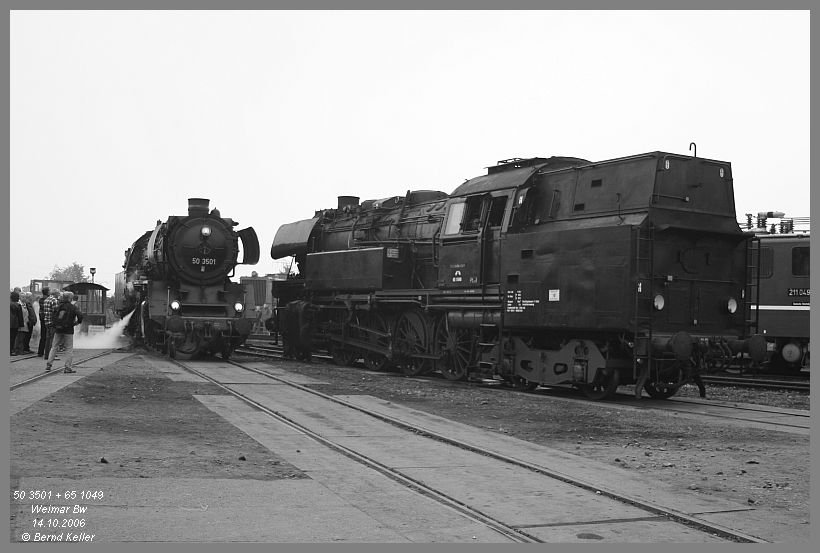 Nachdem die Güterzuglok 50 3501 ihre Runden auf der Weimarer-Drehscheibe gedreht hat, gibt es beim Verlassen eine Begegnung mit 65 1049.