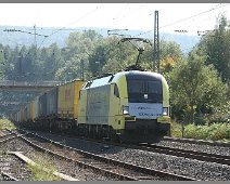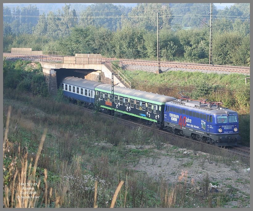Einen unbekannter Sonderzug mit der 1042 520 (welche für das 40jährige Bestehen des Eisenbahn-Kuriers wirbt), kam überraschend aus der