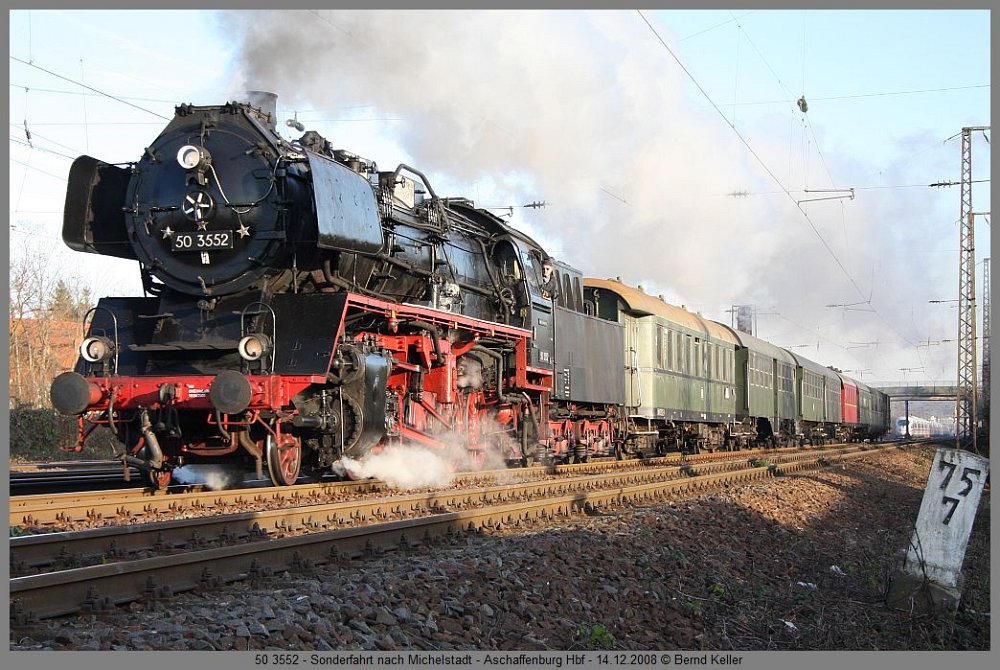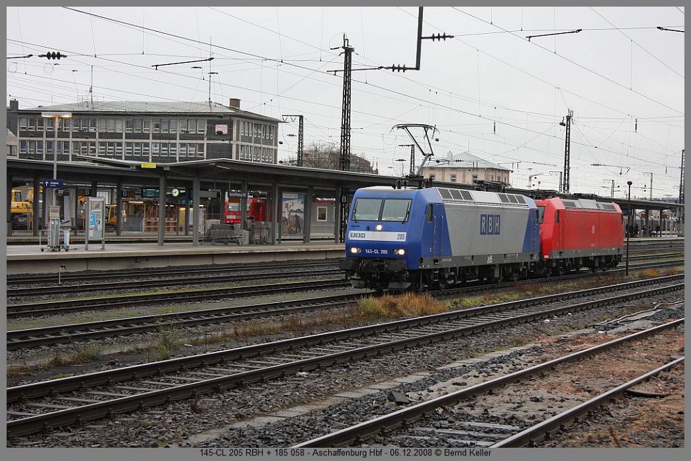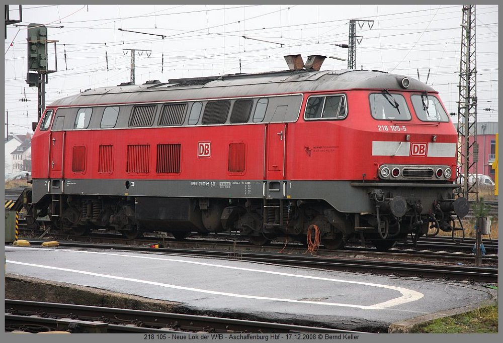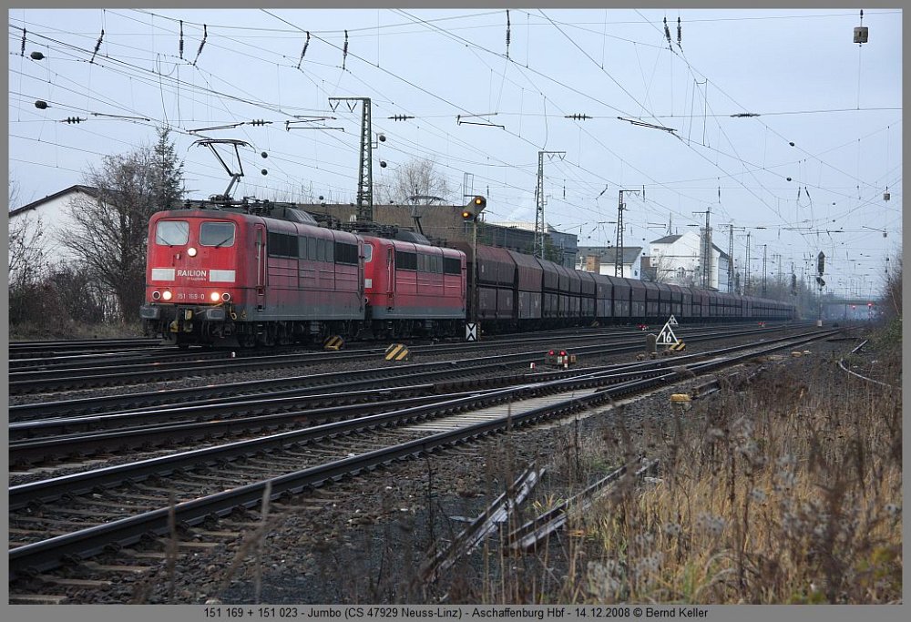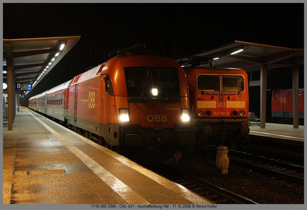 212 007Großkrotzenburg, 01.12.2008 VT 304 + VT 303 HLBGroßkrotzenburg, 01.12.2008 143 265Heigenbrücken, 03.12.2008 103 235Hösbach Bf, TEE 91305 Hamm-Nürnberg, 06.12.2008 145-CL 205 RBH + 185 058Aschaffenburg Hbf, 06.12.2008 155 214 r/wLaufach Bf, 06.12.2008 294 593Aschaffenburg Hbf, Üg Miltenberg-Aschaffenburg, 13.12.2008 1216 901 RTSAschaffenburg Hbf, 13.12.2008 406 084 FORBACH-LORRAINEFrankfurt Hbf, ICE 9556, 13.12.2008 110 434Frankfurt Hbf, 13.12.2008 112 171Aschaffenburg Hbf, RE, 12.08.2008 1016 001 ÖBBAschaffenburg Hbf, CNL 40401, 14.12.2008 185 521 HGKAschaffenburg Hbf, 14.12.2008 50 3552Aschaffenburg Hbf, Dampfzug Aschaffenburg-Michelstadt, 14.12.2008 146 243Aschaffenburg Hbf, RE 4617, 14.12.2008 151 169 + 151 023Aschaffenburg Hbf, CS 47929 Neuss-Linz, 14.12.2008 642 024Aschaffenburg Hbf, 17.12.2008 218 105Aschaffenburg Hbf, 17.12.2008 1116 068Aschaffenburg Hbf, CNL 421, 17.12.2008 E186 149 ITL + 183 500 MGW-SERVICEAschaffenburg Gbf, 17.12.2008 November
