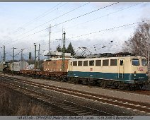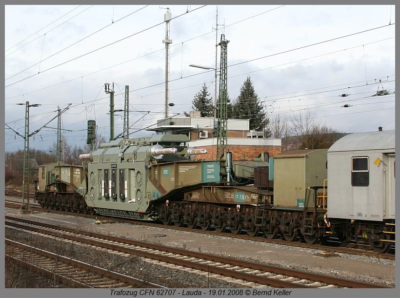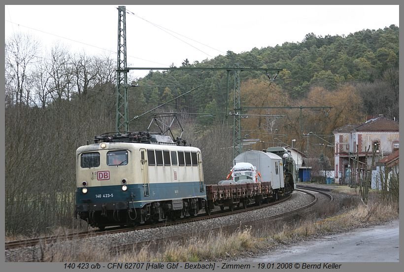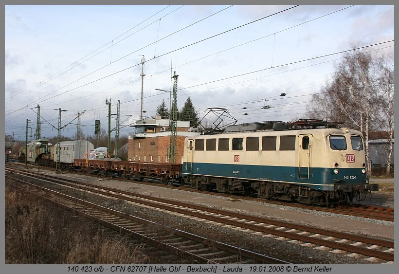 Letzte ozeanblau-beige 140er (140 423) mit einem Trafozug auf dem Weg von Halle nach Bexbach durchquert am 19.01.2008 das Frankenland.